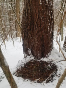 Example of a nest at the base of a large conifer. This is a common den-type of a sow with yearlings. This sow who denned here had 3 yearlings with her. They were treed at the time this photo was taken