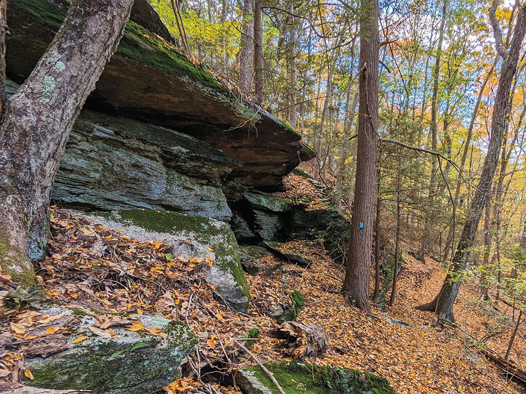 As the trail has improved, it’s been gratifying to witness the growing number of families out enjoying it, especially visitors who are new to hiking. A journey between the two overlooks through Burritt’s Rocks is now challenging in a fun way. As I’m walking, I nod with satisfaction where the treadway was shifted for better footing or to beautify the trail. The aesthetics of the trail are important— the artful curve around a boulder, hand-painted blazes, and even the removal of invasive garlic mustard to reveal a patch of native bloodroot are details that add charm to any hike. If you haven’t hiked this section of the Paugussett in a while, fall is the perfect season to explore it.